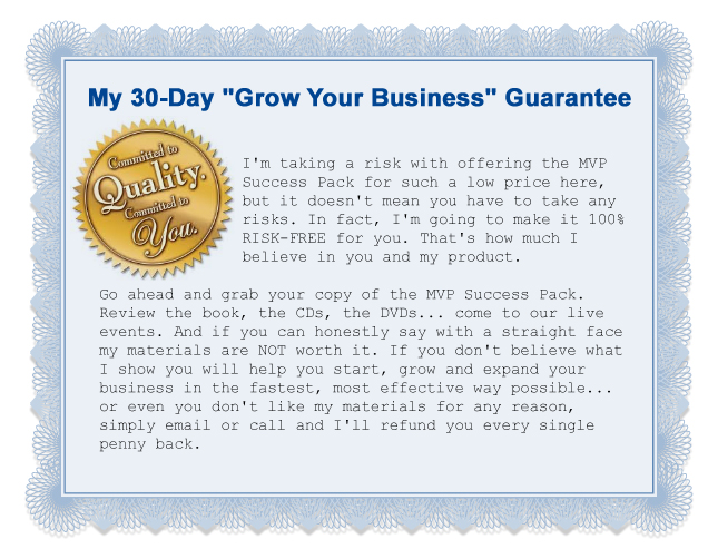 Are you truly serious about starting, growing or doubling your business this year? I know you are. Because if you weren't you wouldn't have read up until this point. I'm positive you're someone who's smart enough to see a good deal when you see one... and this one is a steal of a bargain. But I can't keep it up forever. Good deals like this only come once every ten years. Twenty, in my case. I have never offered so much for so little before. So act now and take advantage of the MVP Success Pack. |